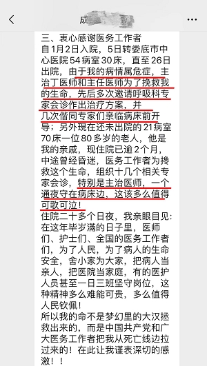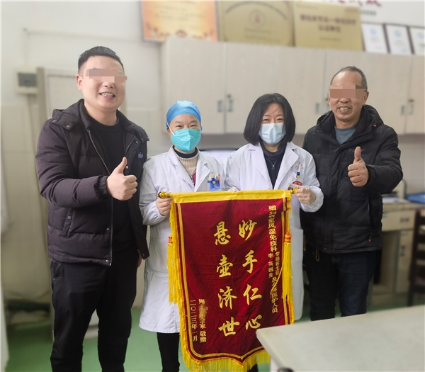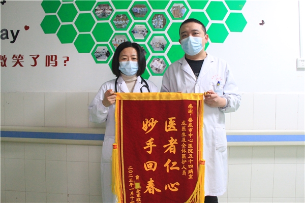 同样为易医生送来锦旗的还有刘奶奶一家。“要是没有你们,我哪还能过得了这个年,真的太谢谢你们了!”情绪略显激动的刘奶奶一边握着易颖婧医生的手,一边向54病室医护人员连连道谢。刘奶奶本身患有高血压和糖尿病等基础疾病,感染新冠肺炎后,身体状况急转直下,在当地医院治疗后始终不见好转,当时家属都失去了信心,抱着最后试一试的想法转入我院治疗。在医护人员的悉心照料下,刘奶奶的病情开始趋于稳定,最终治愈顺利出院。