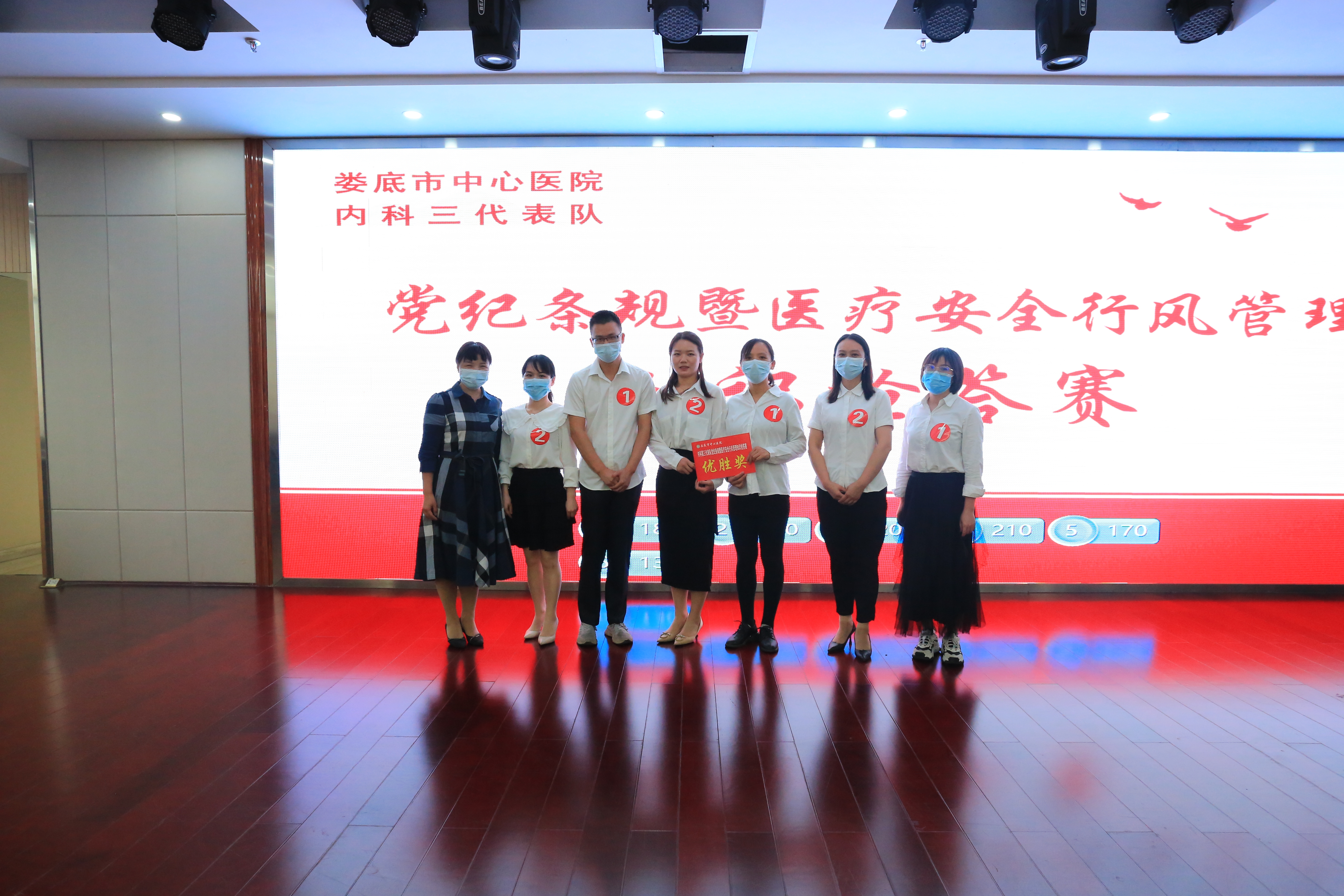 10月21日下午,我院党纪条规暨医疗安全行风管理知识抢答赛内科三代表队初赛在住院部E 区六楼举行,由肾内科支部牵头、含消化内科支部、呼吸内科支部、老年内科全科医学支部、血液内科和内分泌风湿免疫联合支部随机组成的6个党支部代表队的12名选手参加了比赛。最终,以22病室彭晓亮和10病室邓艳组成的2号代表队从6支代表队中脱颖而出获得团体总分第一名。