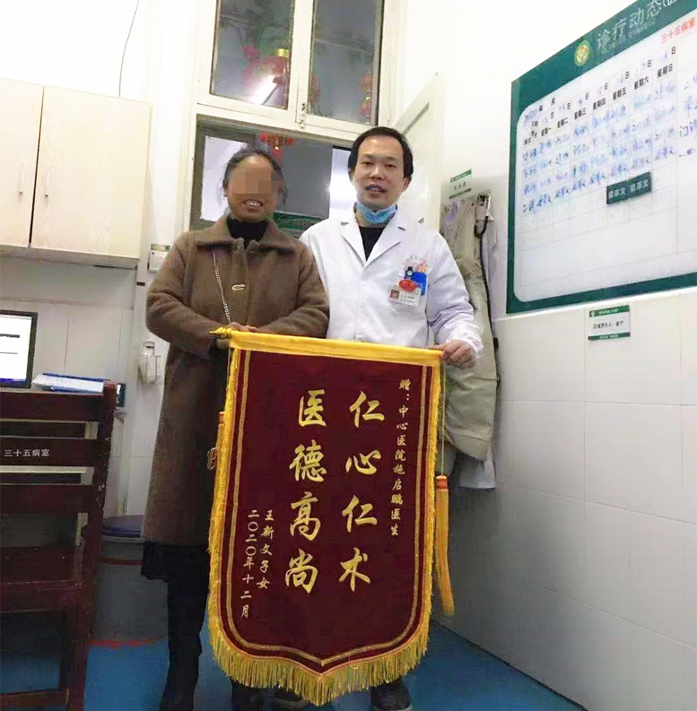 施启鹏的患者中有一名56岁肝硬化患者,经过前期治疗后转诊到长沙进行“人工肝”手术治疗,由于在前期治疗中,他与患者建立了很好的信任,手术后患者又回到35病室做后续治疗,虽然患者最终病情恶化不幸去世,但因施启鹏对待工作高度负责,对待患者和家属高度热情以及良好的医德深深感动患者家属,事后家属还给他赠送了锦旗,以表谢意。