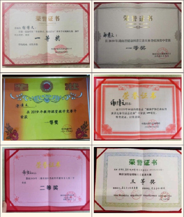 谢博文不仅在医疗技术上得到同事和患者的一致认可,在全国及省市学术交流的舞台也展现出他的青春风采。近年来,他先后在全国和省市病例大赛及教学科普讲解大赛中获得多项荣誉,其中包括:中国内镜杂志——精准护胆经典病例演讲比赛全国总决赛“一等奖”;第一届“杏林妙手,优术匠心”手术视频比赛-湘中赛区“一等奖”;湖南省教师课堂教学竞赛“一等奖”;我院第二届课堂教学竞赛“一等奖”;湖南省健康科普宣讲大赛娄底赛区“一等奖”;湘南普外联盟手术视频比赛总决赛“二等奖”;湖南省“鲁蜀湘豫,无问西东”手术视频比赛二等奖;湖南中医药大学教学竞赛“二等奖”;我院第二届优秀病例书写“二等奖”;湘南地区普外联盟播客秀大赛中“二等奖”;湖南省健康科普宣讲大赛三等奖;湖南省首届创新创业大赛“三等奖”等众多奖项,并多次评选为优秀岗位及优秀带教老师。主持课题一项,以第一作者发表论文5篇。