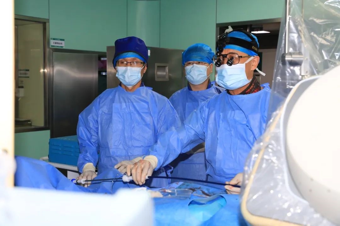 尹晓清教授(右一)带领团队进行主动脉覆膜支架腔内隔绝手术