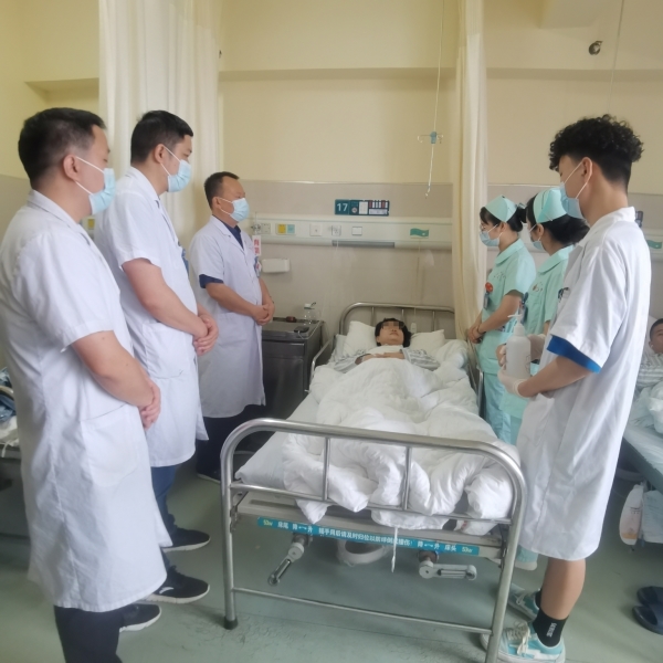 6月9日上午8点,在我院53病室(泌尿外科)17床旁,科室主任、泌尿外科党支部书记康乐、主治医师童亮、医师蔡家荣、护士长张玲、主管护师刘艳梅等一行正在对肾结石术后患者肖女士开展床旁“医护一体化”查房,这也是我院卓越护理工作中的一个缩影。