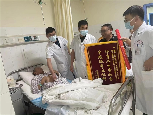 “正是因为贵院的医护人员修身济生有担当,我父亲才会得到有效救治,并得以快速恢复。衷心感谢他们,他们用实际行动树立了榜样!”8月7日,笔者接到我院6病室(普外科)69床家属苏先生的电话,他言辞恳切,感谢6病室医护人员和我院MDT团队。见到苏先生后,他将一面印有“修身济生有担当,卓越服务立标杆”烫金字样的鲜红色锦旗和感谢信送到了医护人员的手上,称赞不迭。