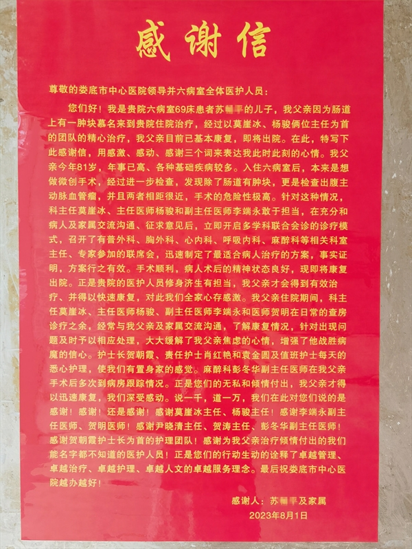 “我父亲住院期间,科主任莫崖冰、主任医师杨骏、副主任医师李端永和医师贺明在日常的查房诊疗之余,经常与我父亲及家属交流沟通,针对出现问题及时予以相应处理,大大缓解了我父亲焦虑的心情,增强了他战胜病魔的信心。”苏先生在感谢信中写道,“护士长贺朝霞、责任护士肖红艳和袁金圆及值班护士每天的悉心护理,使我们有置身家的感觉。麻醉科彭冬华副主任医师在我父亲手术后多次到病房跟踪情况。正是你们的无私和倾情付出,我父亲才得以迅速康复,我们深受感动。”