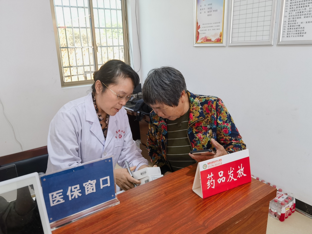 科研科副科长、副主任护师梁义为村民发放健康宣传资料