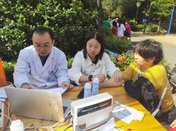 脊柱外科主任、主任医师陈良龙博士带领团队开展义诊,耐心细致地为前来咨询的居民朋友答疑解惑、检查身体、健康宣教和发放骨骼健康知识宣传资料,并免费测量骨密度、血压、血糖。