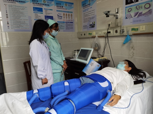 18病室(心血管内科)主任、主任医师唐湘宇介绍,体外反搏是一种无创的、安全的、疗效确切的用于缺血性心脑血管疾病康复、治疗的特色技术,被誉为“躺在床上的马拉松”“不需要外科的心脏搭桥”,适应人群较为广泛,不仅适合各种缺血性心脑血管疾病患者,同时还适用于术后患者的康复保健,并有消除运动性及脑力性疲劳的作用。