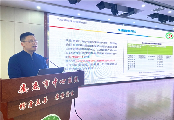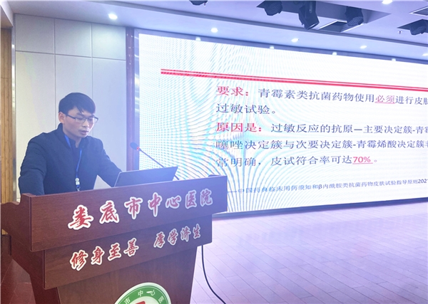 会上,杨吉军主任首先以β内酰胺类抗菌药物过敏预防与处置为主题,就β内酰胺类抗菌药物皮试的背景与现状、β内酰胺类抗菌药物过敏反应的预防、β内酰胺类抗菌药物过敏的救治等内容,结合临床工作经验,为抗菌药物的合理应用、患者用药安全保驾护航。