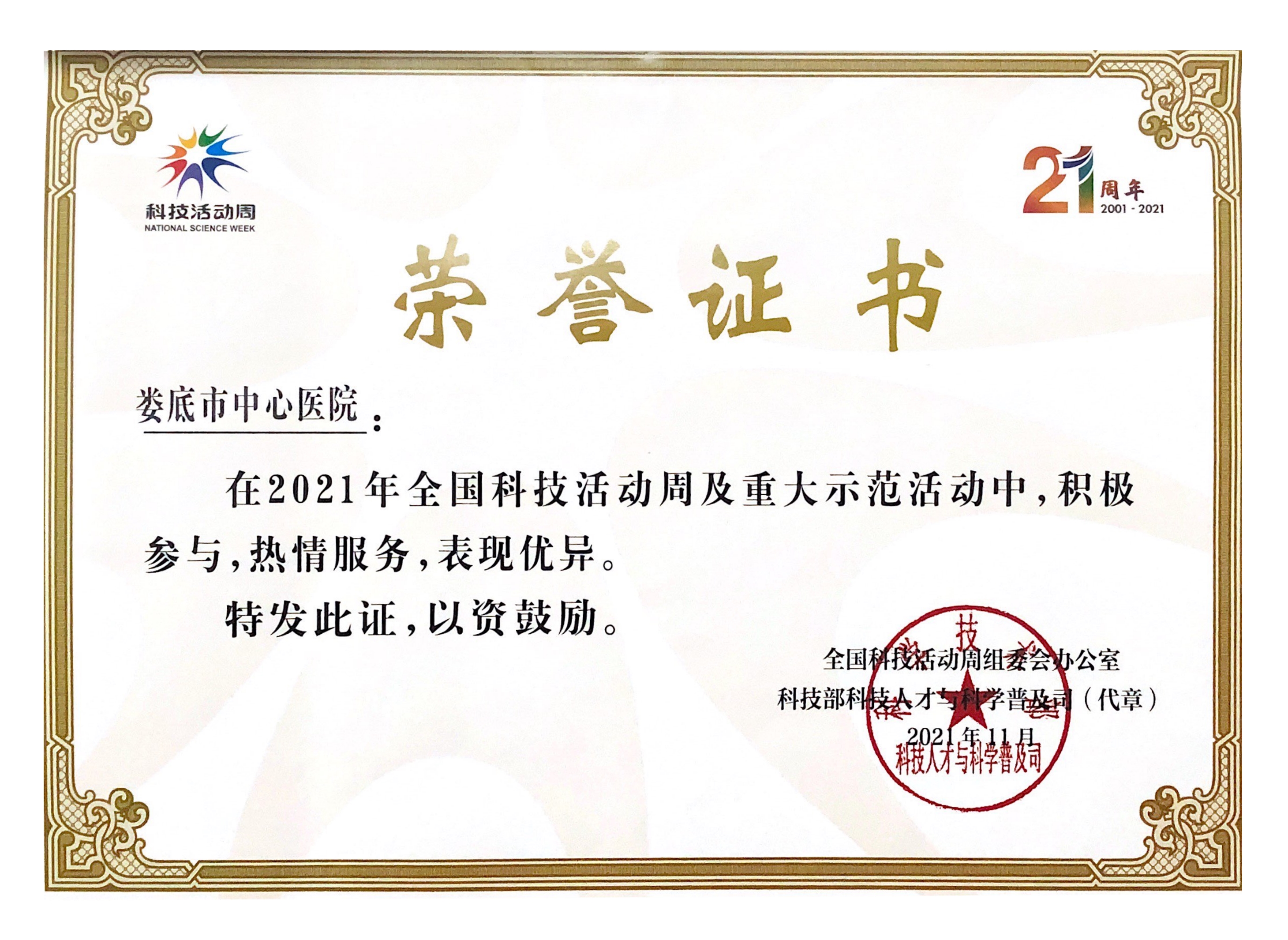 近日,从湖南省科技活动周组织委员会传来好消息,我院在2021年全国科技活动周及重大示范活动中积极参与、热情服务,荣获表现优异荣誉证书。