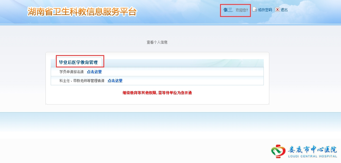 登录之后,页面显示自己的姓名。此页面可以修改密码。毕业后医学教育管理下,点击学员申请报名后的“点击这里”。