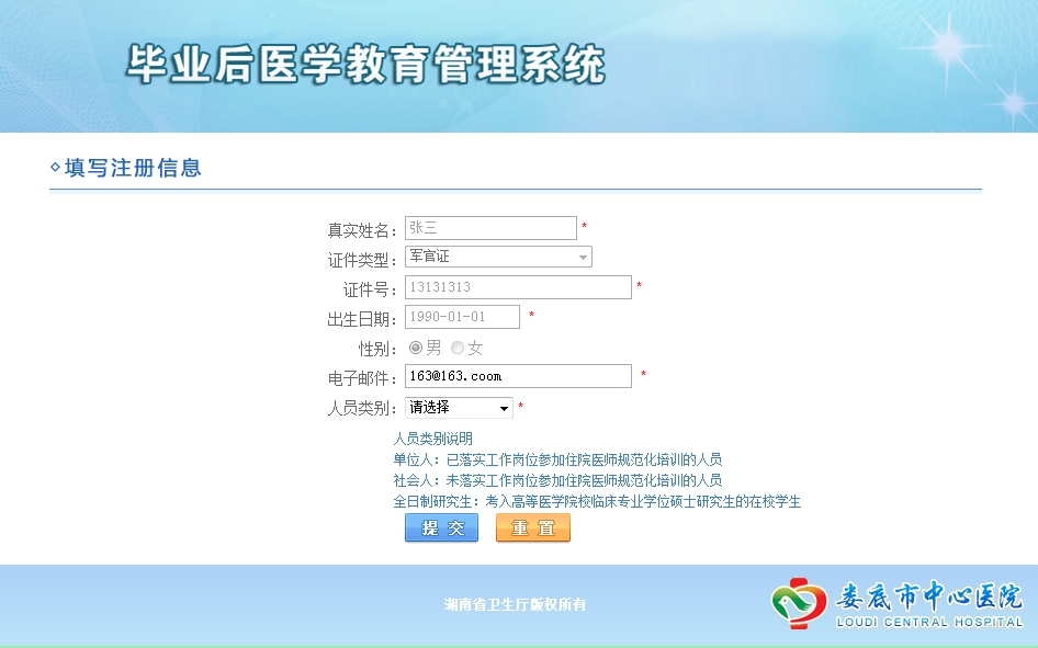系统会提示自己的注册信息,选择人员类别,并查看一下是否正确。如果有误,点击“重置”按钮,如果正确,点击“提交”。