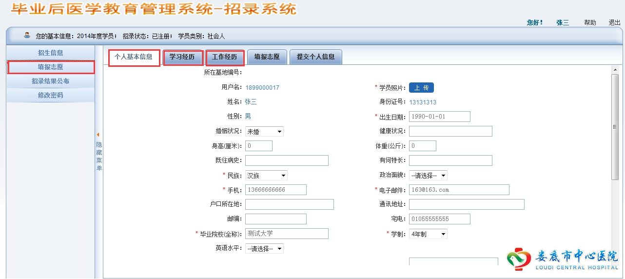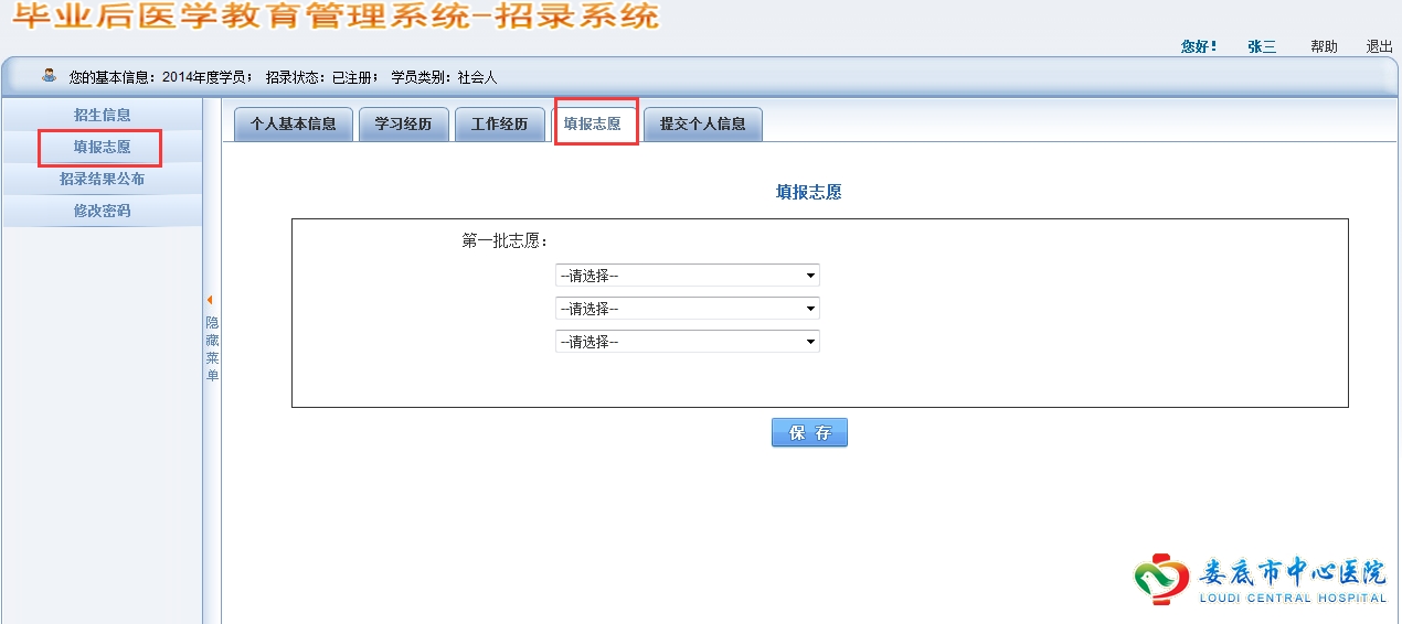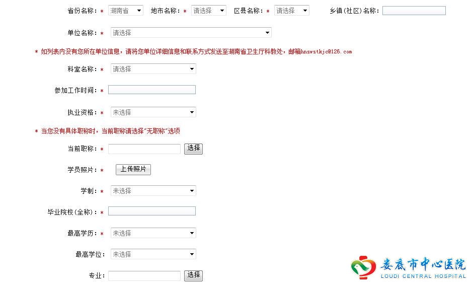 (二)个人报名和志愿填报:根据本人从事或拟从事的专业,每人可填报两个志愿。愿意来我院参加培训的学员请在第一志愿填报娄底市中心医院。