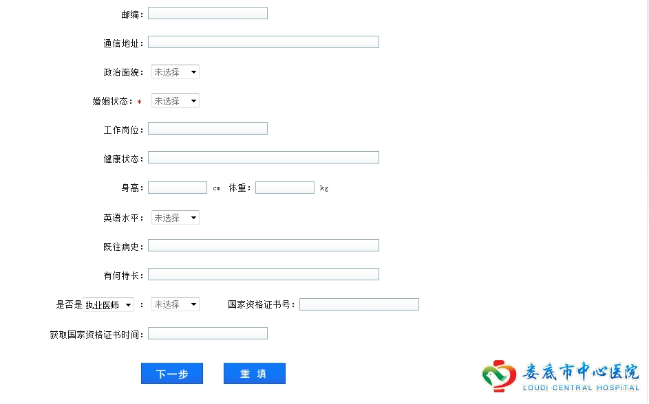 在点击下一步后,此页面填写完毕后,如果想重新填写上一页的内容,那么点击“上一步”,如果信息错误,想重新填写,可以点击“重填”,如果信息正确,点击“提交”。
