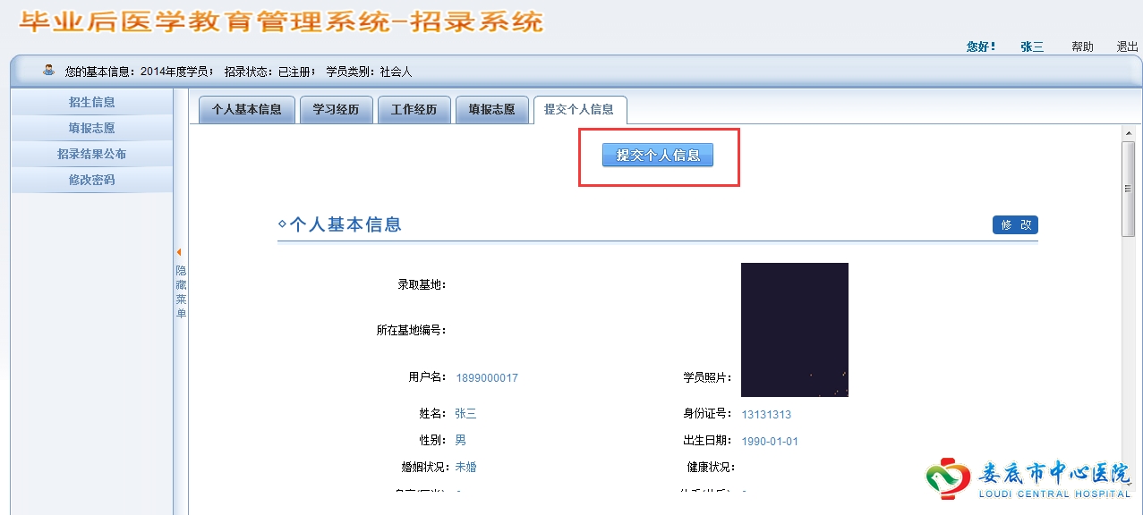 进入“提交个人信息”页面,在这里您需要确认之前填写的信息和填报的志愿是否准确无误,如果无误点击“提交个人信息”按钮即上报,注意:上报后的信息无法修改,请您谨慎提交。