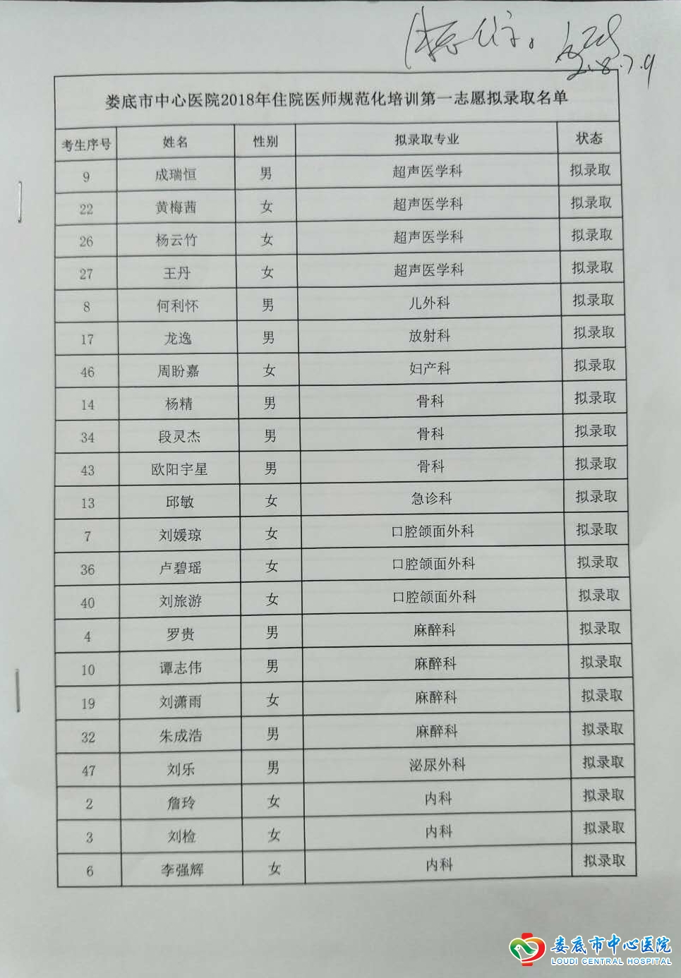 娄底市中心医院2018年住院医师规范化培训第一志愿拟录取名单