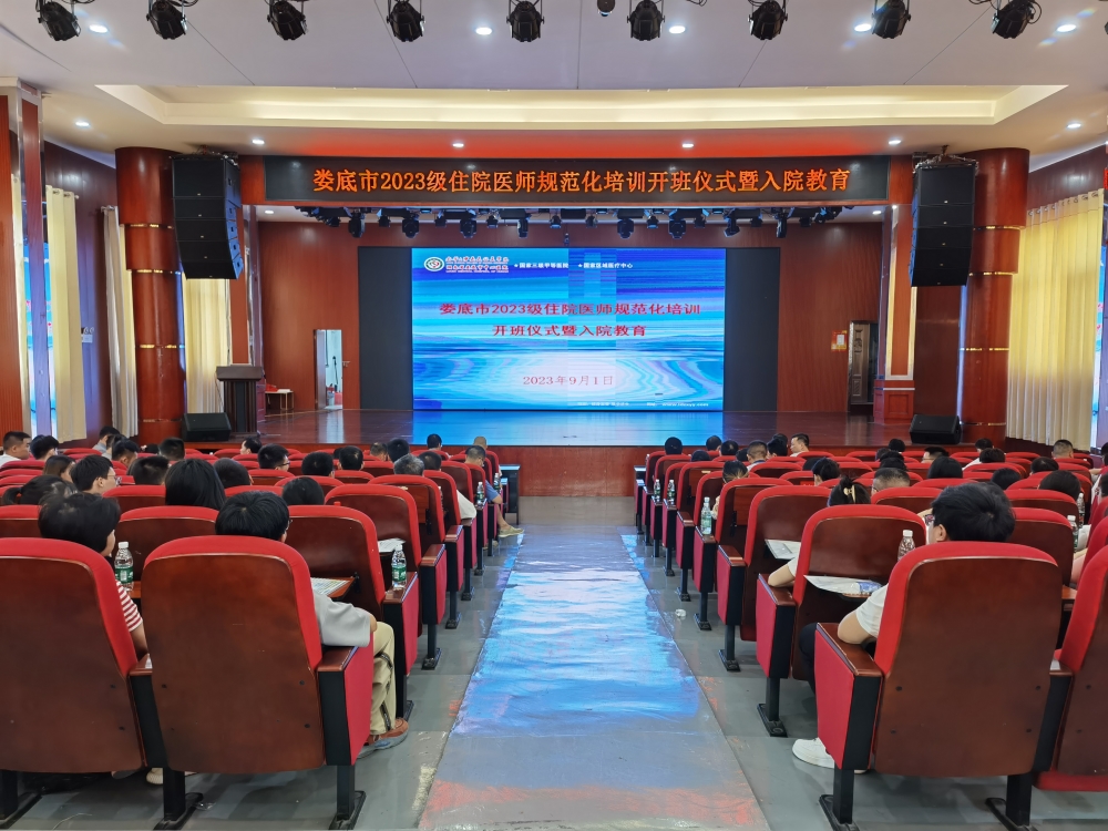 住培启航,筑梦未来!为培养合格住院医师,提升综合素养和专业技能,9月1日,娄底市2023级住院医师规范化培训开班仪式在我院举行。我院党委委员、副院长龚铁逢出席会议并讲话,教学办主任杨翊翔致欢迎辞,副主任彭喜开主持会议。医务、总务、临床技能培训等相关职能科室负责人、各专业基地负责人及93名2023级住院医师(含专硕研究生16名)参加会议。