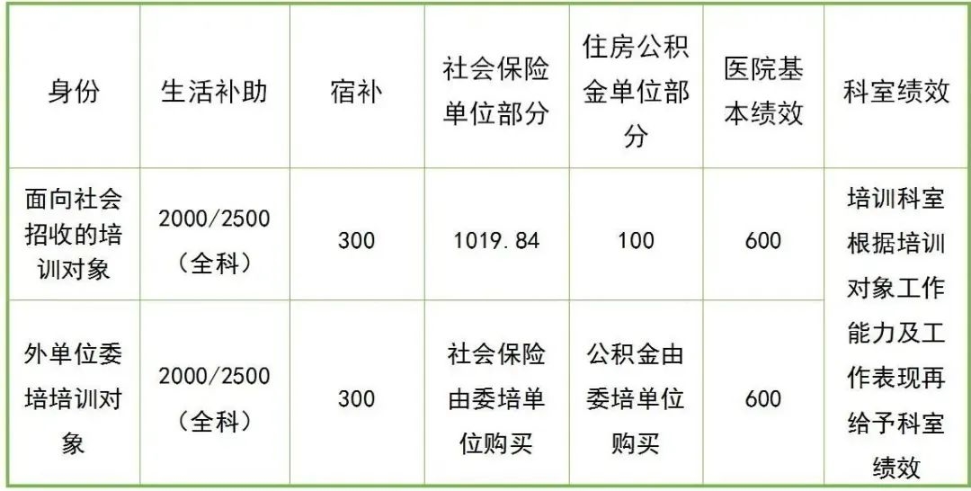 2.基本社会保险:面向社会招收的住院医师由我院发放基本工资和绩效及购买基本社会保险;外单位委派的住院医师由委托培养单位管理人事档案并负责购买基本社会保险,我院发放国家规定范围内的生活补助。