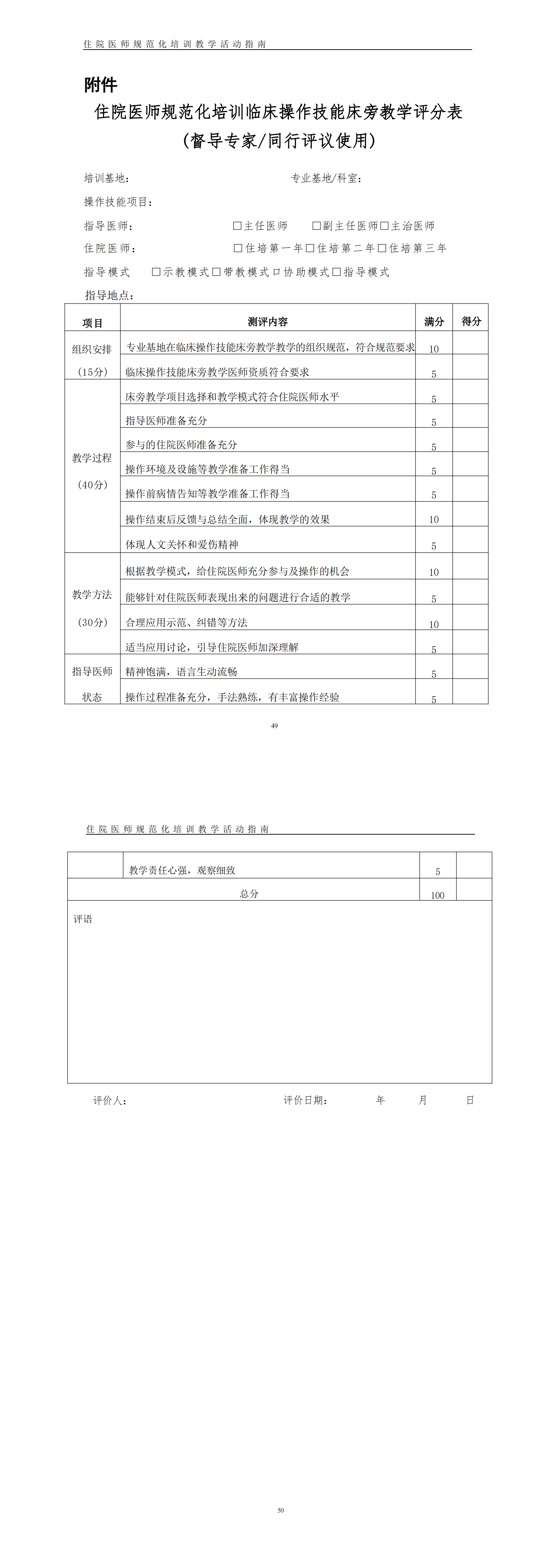 住院医师规范化培训临床操作技能床旁教学评分表(督导专家/同行评议使用)