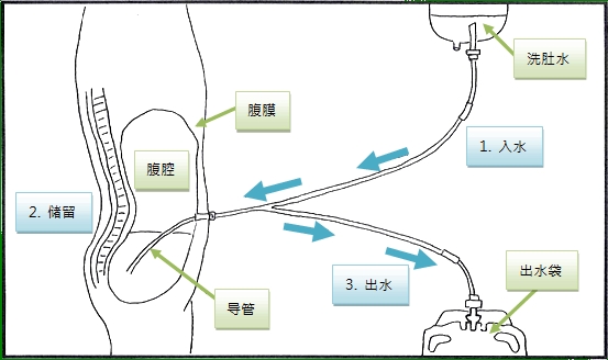 腹膜透析的方法是向腹膜腔内注入称为透析液的液体。透析液留腹一段时间之后将其排出,再注入新的透析液。大多数成人注入的透析液的量为2 L,但体格小的患者通常可减少注入量,相反体格大的患者则可增加(临床上大部分用药都是考虑患者体格进行个性化用药)。透析液留腹期间发生溶质扩散和超滤,之后弃置使用过的透析液,并重复上述循环。