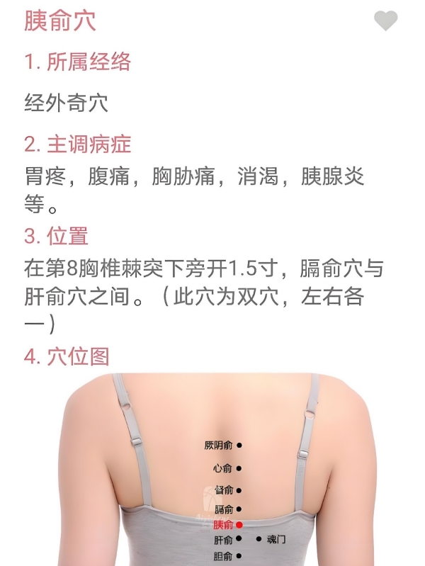胰俞穴(经外奇穴,第8胸椎棘突下旁开1.5寸):