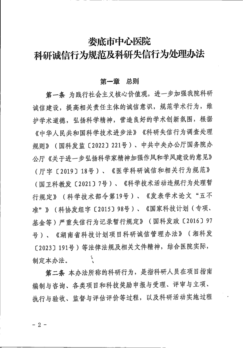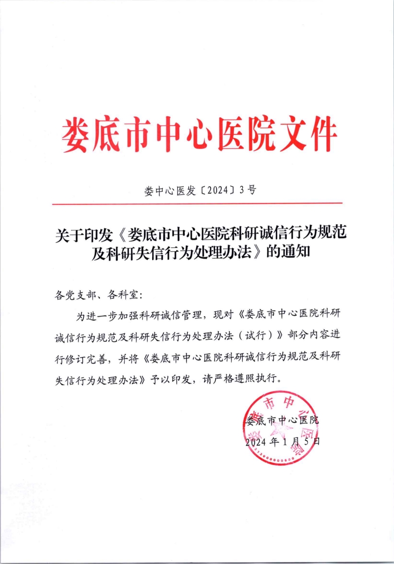 关于印发《娄底市中心医院科研诚信行为规范及科研失信行为处理办法》的通知