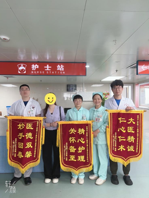 5月7日,孙女士家属将三面分别写着“妙手回春,艺德双馨”“仁心医术,大医精诚”“关怀备至,精心护理”的锦旗送到我院心胸大血管外科医护人员手中,以感谢对其母亲的救护之情。