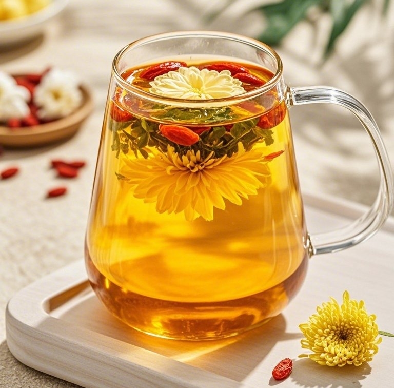 菊花枸杞茶:菊花5朵、枸杞10g,热水冲泡或煎汤代茶饮。菊花清肝泻火,枸杞补肾益精,养肝明目,二者能清肝补肝明目,特别适合长期面对电脑手机用眼过度的人群,能够缓解视疲劳。