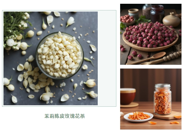 茉莉陈皮玫瑰花茶:茉莉花、玫瑰花各3g、陈皮5g,热水冲泡或煎汤代茶饮。能疏肝理气、清肝明目,适合经常熬夜、肝火旺盛的人群。