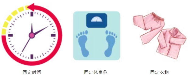 1.固定时间称重:每日晨起排尿后、早餐前测量体重。