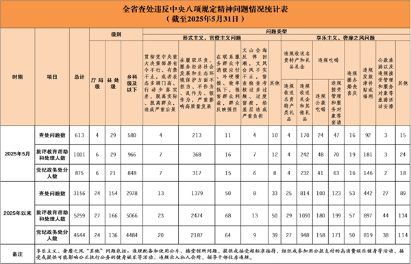 湖南省纪委监委深入贯彻中央纪委国家监委工作部署,在全省各地各部门各单位建立了落实中央八项规定精神情况月报制度。2025年以来,截至5月31日,全省查处违反中央八项规定精神问题情况如下: