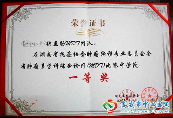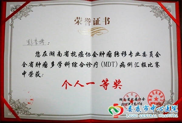 为促进学术交流,推动肿瘤规范化诊疗的发展,8月18日至19日,湖南省抗癌协会肿瘤转移专业委员会第二届学术会议暨第三届腹部恶性肿瘤综合治疗湘江论坛在长沙召开。会上,我院在全省肿瘤多学科综合诊疗(MDT)比赛中荣获一等奖,十二病室(肿瘤内科)一区医师彭李博荣获病例汇报个人一等奖。