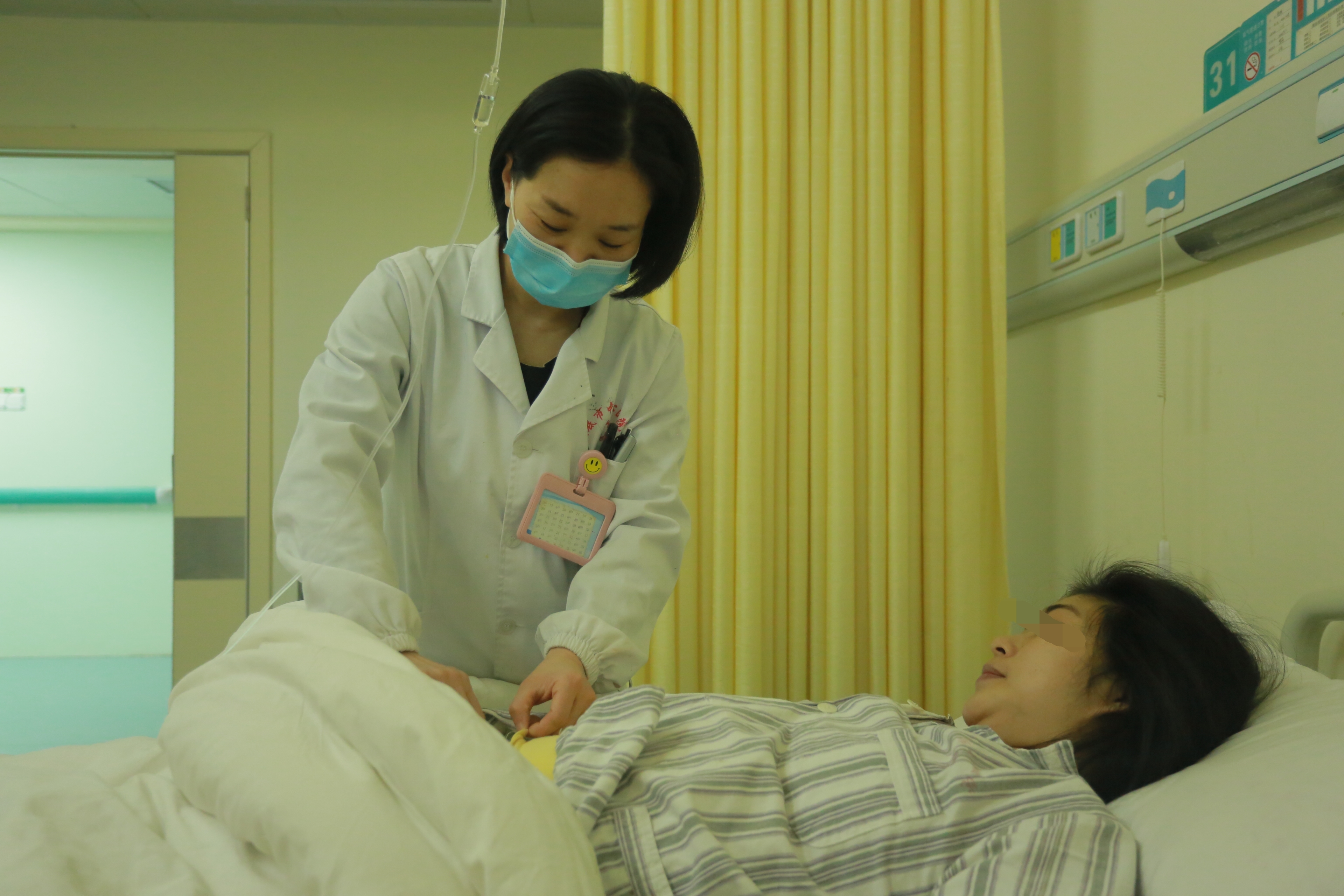 “今天感觉怎么样?伤口疼吗?给宝宝哺乳了吗?”清晨,娄底市中心医院产科一区(5病室)主治医师曾莉来到31床,一边俯身查看剖宫产伤口,一边轻声了解产妇和宝宝的情况。