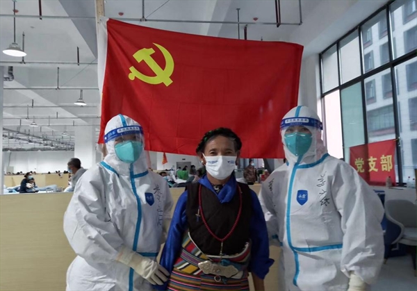 在西藏方舱医院里交接班,右一为覃红
